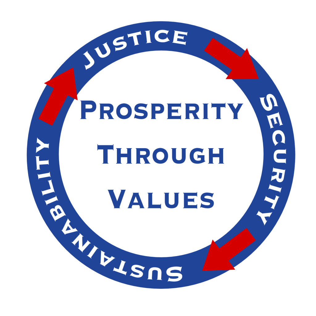 The three Democratic values of Justice, Security and Sustainability create a circle of success. If we honor them, they will produce the conditions for true prosperity. Together they answer the key questions every American should ask about any government policy:
