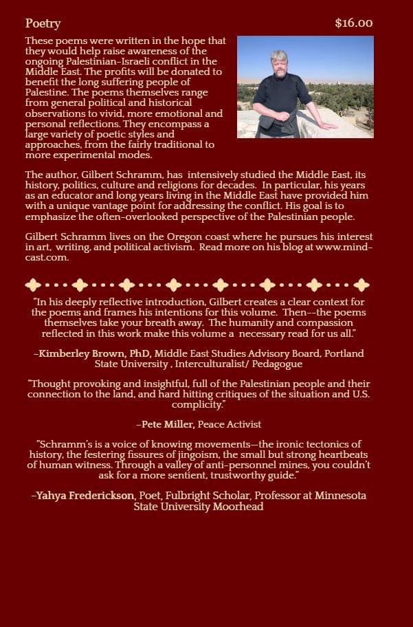 I have completed work on a collection of protest poems about Palestine. Profits will go to benefit the Palestinian people. We are just waiting to see proof copies. I hope to send out details on where to purchase it very soon. It looks like this…
